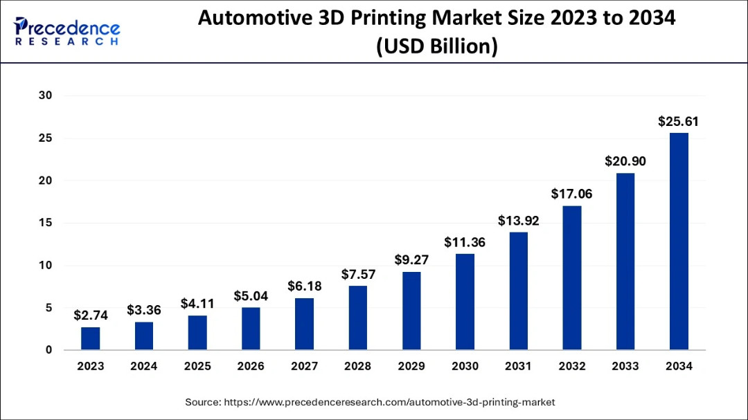 Precedence Research:2034年全球汽车3D打印市场规模将增至256.1亿美元